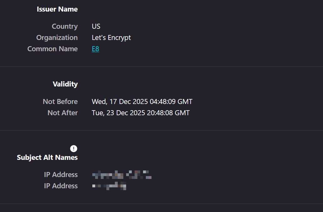 注意这里我们必须使用 shortlived 这个 Profile,因为 Let's Encrypt 的 IP 证书有效期只有 6.66666 天(160 小时),同时 acme.sh 需要更短的时间来进行检查更新证书,所以可以设置 --days 3 参数,让它 3 天检查并更新一次,你也可以设置 4 或 5,但是不要设置 6,否则可能证书过期了都没更新哦。